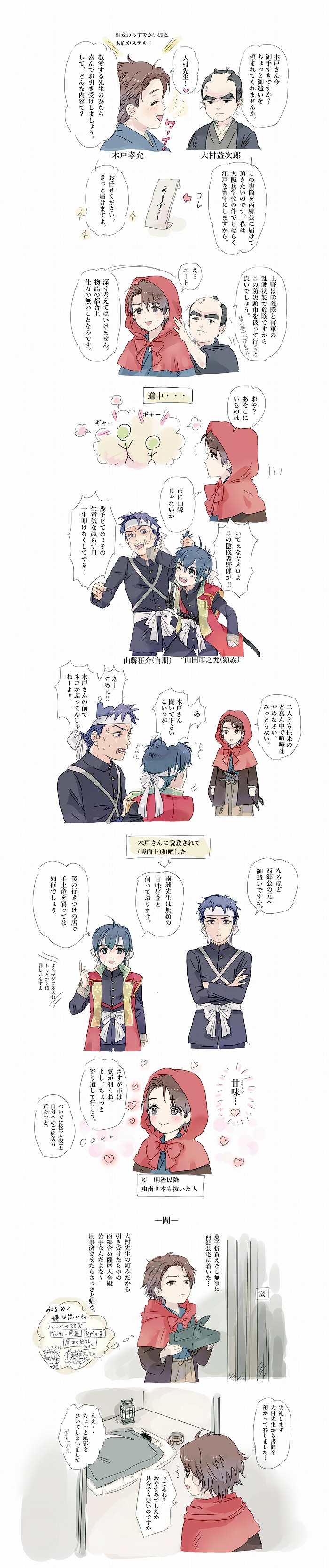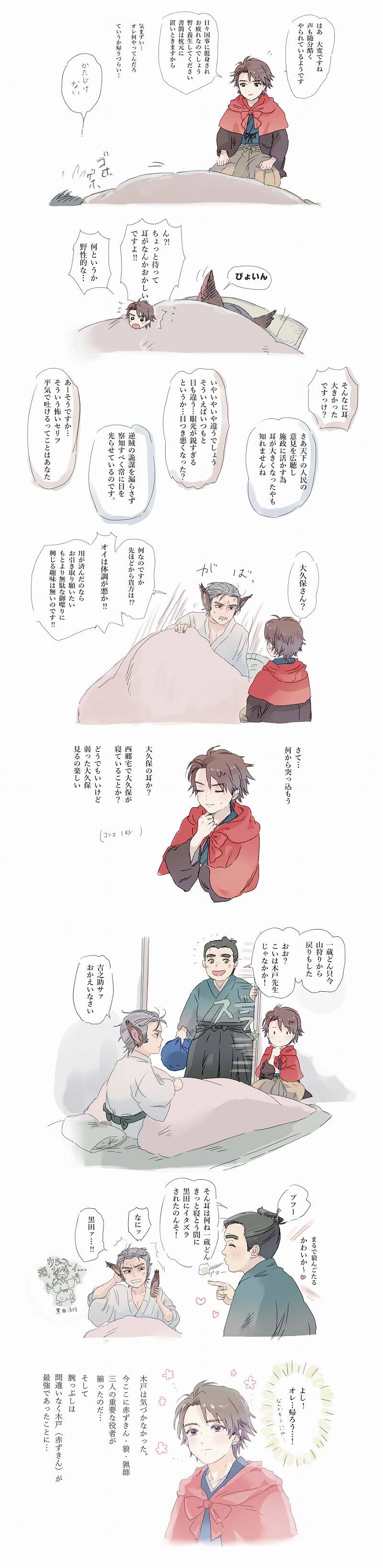 狼耳は黒田のせいにしてしまいました…(苦肉の策)。酒乱の彼なら、大久保さん相手でもふざけたことができるんじゃないかな、と。酔うと誰も想像つかないような突飛な行動に出ますからね。彼は。