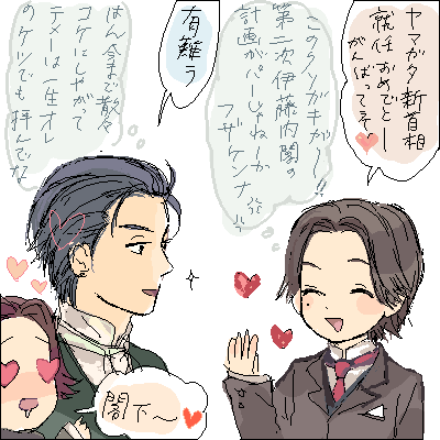 犬猿の仲の伊藤博文VS山縣有朋…(ガタにくっついてるのはニコポン(桂太郎))