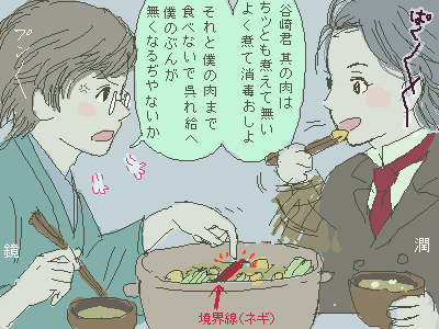 鏡花はネギか何かの具でナベの中に境界線をこさえて、「こっちから手前は自分の領土だ!」と宣言し、辛うじて数切れの肉にありつけたという。